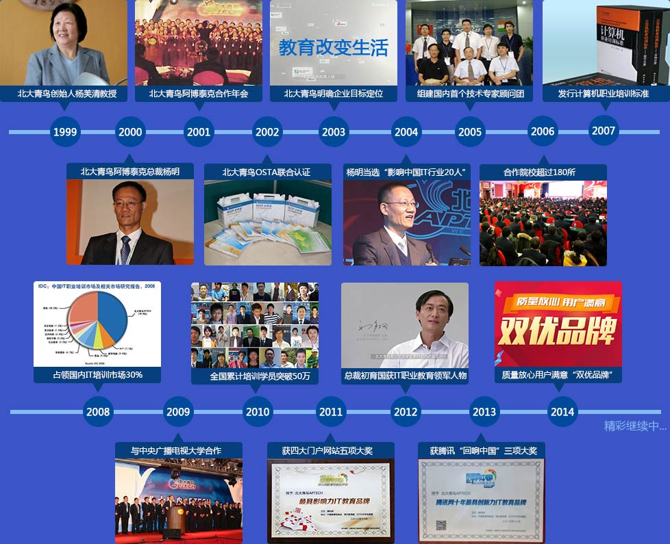 北大青鳥成立于1999年,22年來專注于培養中國IT技能緊缺型實用人才,已經成長為中國IT職業教育第一品牌。北大青鳥十五年是伴隨中國IT信息產業成長的22年,也成為中國年輕 人學IT技術的最美見證者。北大青鳥22年發展速度之快、經營模式之大、學員人數之多,在中國IT職業教育史上絕無僅有、一枝獨秀。目前全國200家中心實行了統一經營管理,嚴格保證了教學 質量,受到了全社會和業界的一致好評。作為一個學習IT技術的最美見證者,青鳥成為了一個在年輕人想要進入IT行業時的引路人,成為幫助他們完成IT夢想定制的圓夢企業。22年,北大青鳥和 青鳥學員一起走過,并將一起見證更加美好的未來!