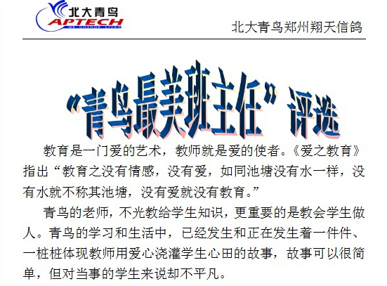 鄭州北大青鳥(niǎo)翔天信鴿“青鳥(niǎo)最美班主任”評(píng)選! 教育是一門愛(ài)的藝術(shù),教師就是愛(ài)的使者,《愛(ài)之教育》指出“教育之沒(méi)有情感,沒(méi)有愛(ài),如同池塘沒(méi)有水一樣,沒(méi)有水就不稱其池塘,沒(méi)有愛(ài)就沒(méi)有教育”。
